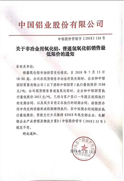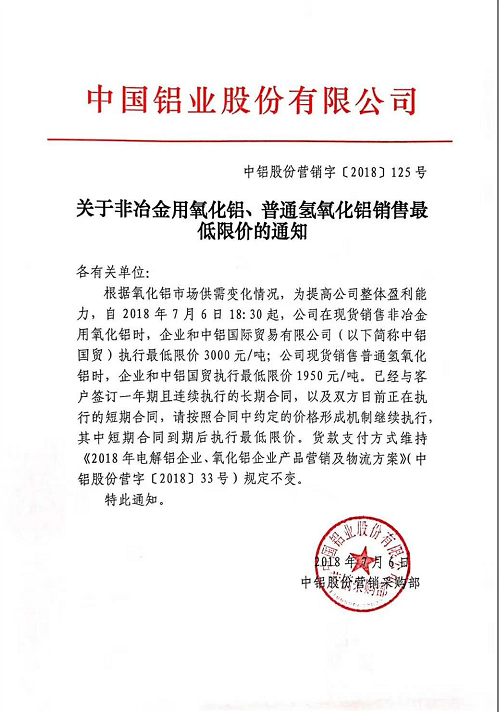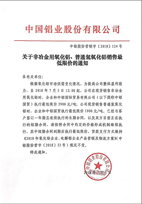 -7月13號(hào),中鋁本月第三次發(fā)布最新非冶金用氧化鋁、普通氫氧化鋁銷售最低限價(jià)的通知,所執(zhí)行最低限價(jià)分別為3100和2015(元/噸)。此前,中鋁在7月5日和6日已連續(xù)兩次通知提高最低限價(jià),非冶金氧化鋁和普通氫氧化鋁限價(jià)分別從2900和1900調(diào)整至3000和1950(元/噸)。