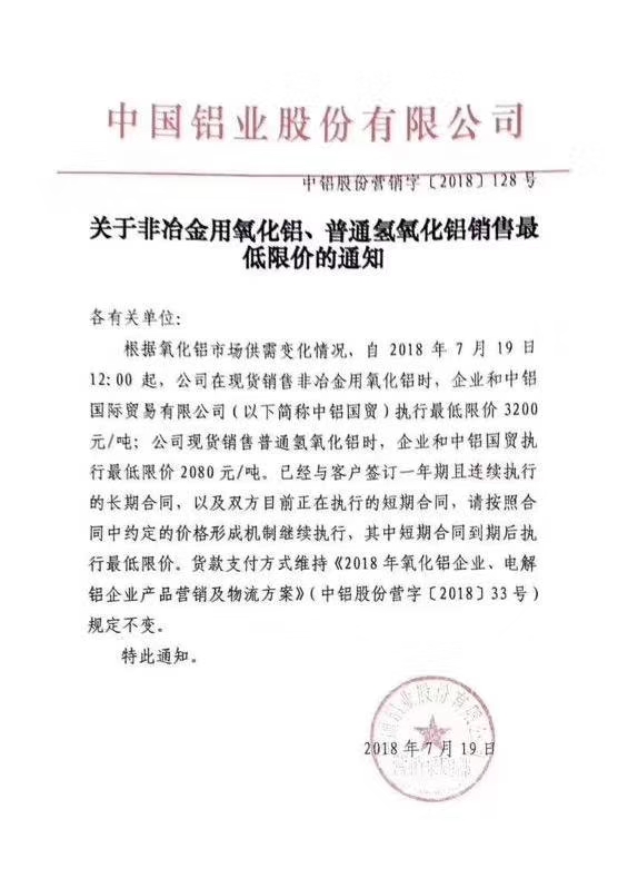 -7月19日,中鋁本月第四次發(fā)布最新非冶金用氧化鋁、普通氫氧化鋁銷售最低限價(jià)的通知,所執(zhí)行最低限價(jià)分別為3200和2080(元/噸)。此前,中鋁在7月5日、6日、13日已連續(xù)三次通知提高最低限價(jià),非冶金氧化鋁和普通氫氧化鋁限價(jià)分別從2800和1850調(diào)整至3100和2015(元/噸)。