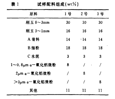骨料包括致密剛玉;|(zhì)包括活性氧化鋁粉、結(jié)合劑水泥等。骨料和基質(zhì)質(zhì)量比為70:30,保持配比不變,更換不同粒度的活性氧化鋁微粉測定澆注料的各項性能。具體配料方案見下面表1。