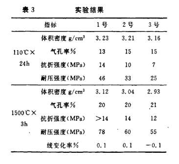 把制作攪拌好的料制成160X40X40mm試塊各3組,測試110℃X24h處理后氣孔率、體積密度、抗折強(qiáng)度、耐壓強(qiáng)度和1500℃X3h處理后氣孔率、體積密度、抗折強(qiáng)度、耐壓強(qiáng)度、燒后線變化。實(shí)驗的結(jié)果見下表3。